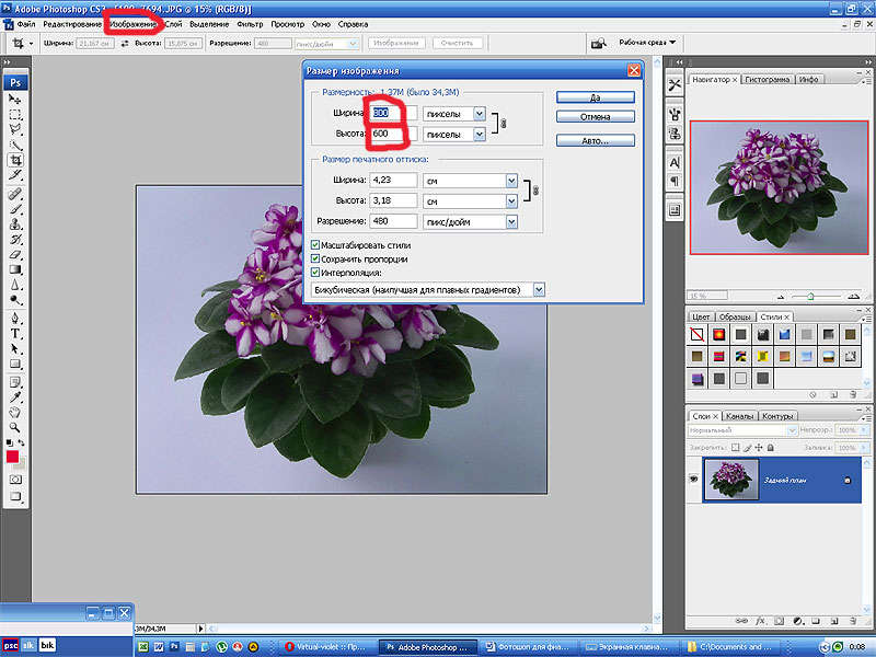 Через Изображение --> Размер изображения устанавливаем удобный для WEB размер. Обычно это 800*600. Или по своему усмотрению.