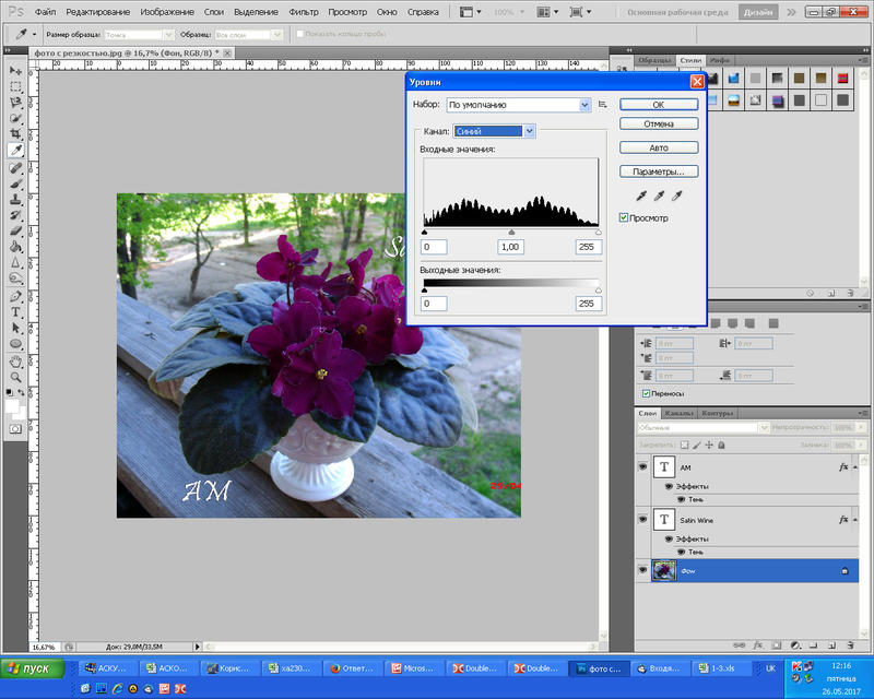 4. Фото получилось синеватым, поэтому уменьшаю немного синие оттенки. Это можно делать разными способами, я выбрала такой (Изображение/коррекция/уровни).